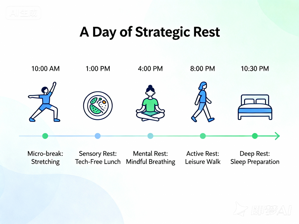 - 认知重构:请将休息重新定义为一项重要的健康投资,而非时间浪费。它和锻炼、健康饮食一样,是维持高效能和创造力的基石。
